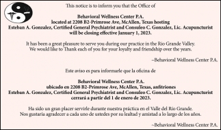 Dec 28, 2022. Behavioral Wellness Center P.A. Notice Ads from The Monitor